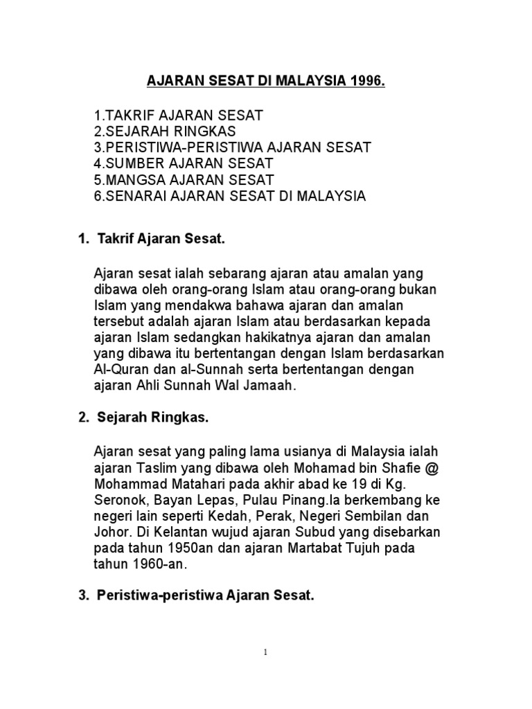 AJARAN SESAT published by ALANI ALI on 2020-04-02. Up to 24 cash back Adalah dipercayai ajaran sesat telah muncul di Malaysia pada awal abad ke 19 di Kampung Seronok Seberang Perai Pulaul Pinang. Ini adalah kerana Malaysia terdiri daripada 60 orang Islam dan majoritinya berbangsa Melayu dan selebihnya 40 terdiri dari penganut agama Kristian Hindu Buddha Sikh kepercayaaan orang asli dan lain-lain lagi.